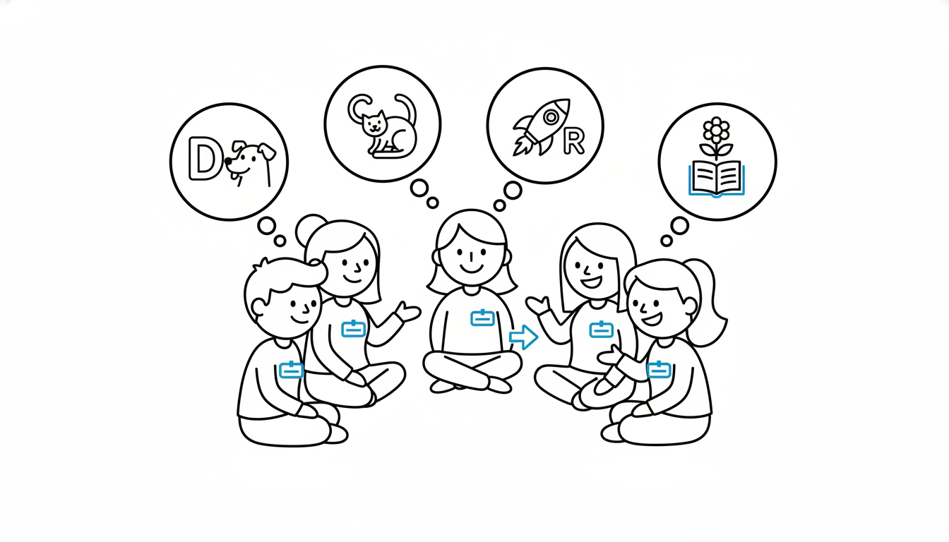 - EXPLAIN (30 seconds) - "Go around the circle. Say your name and something you like that starts with the same letter. For example: 'I'm Sarah and I like soccer.'"