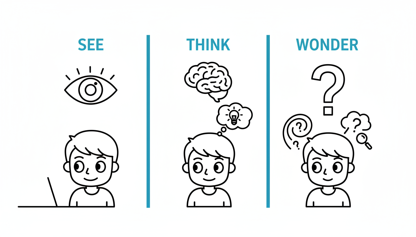 The three-step structure scaffolds increasingly deep thinking. "See" is accessible—everyone can observe. "Think" requires interpretation, activating prior knowledge to make meaning. "Wonder" generates curiosity and sets purpose for learning. The routine makes thinking visible and teaches that good thinking involves observation, interpretation, AND questioning. This explicitly models inquiry habits.