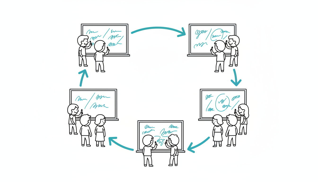 Board Rotation is a kinesthetic brainstorming strategy where groups move from board to board, reading what previous groups wrote and adding their own ideas. Use this when you want to generate many ideas quickly, build on others' thinking visibly, and energize the room through movement. It's ideal for generating multiple perspectives on related questions or exploring different aspects of a complex topic.