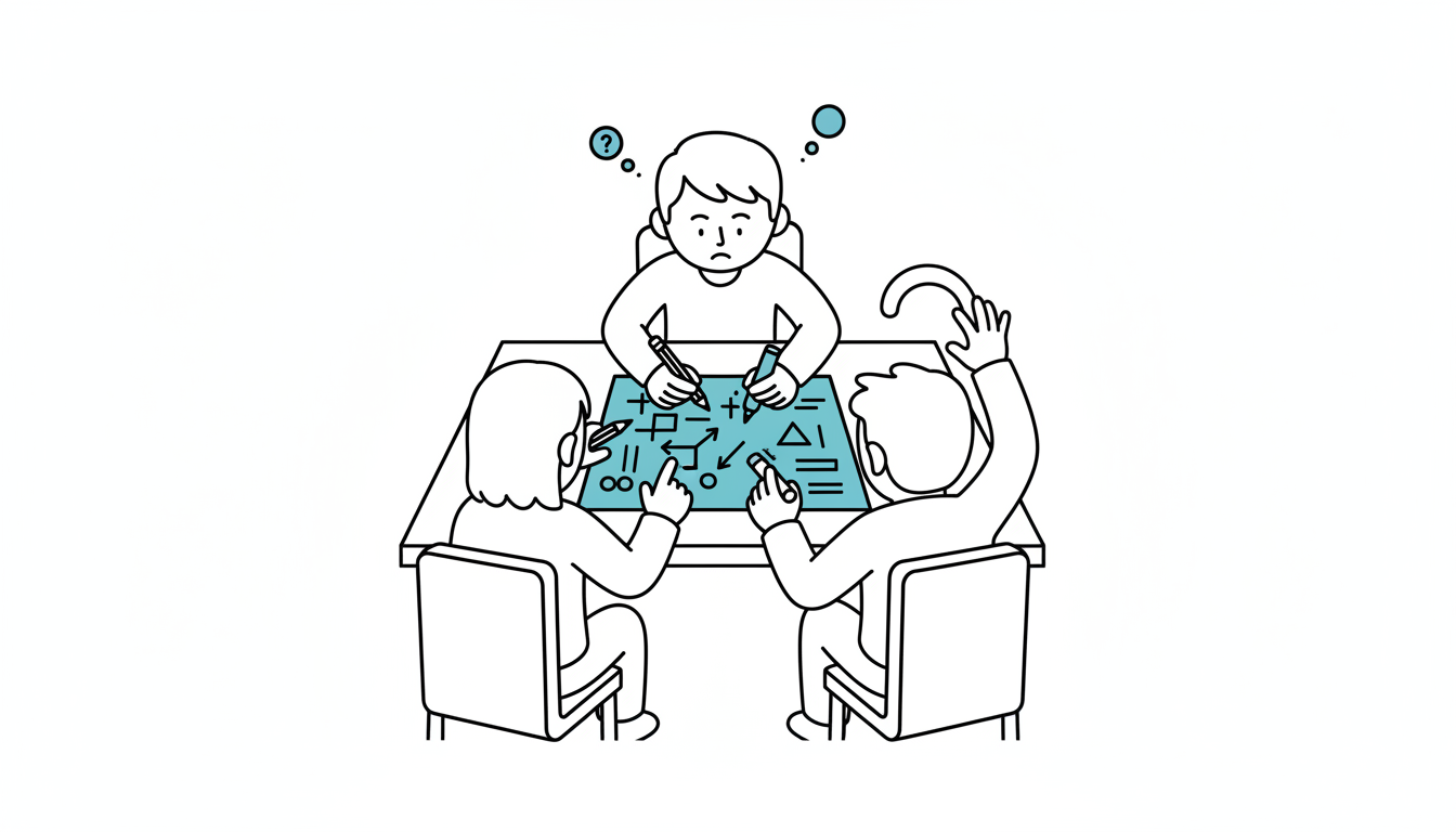 Solution: That's the point! Let them struggle briefly, then they'll figure out nonverbal communication strategies—pointing, gesturing, drawing arrows, building on each other's work organically.