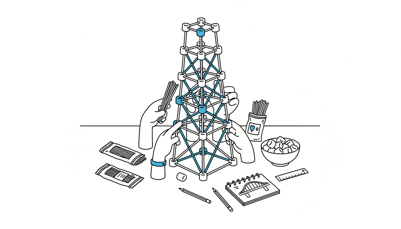 Opening: "Your challenge: build the tallest free-standing tower that can hold a marshmallow on top. You have exactly 20 spaghetti sticks, 1 yard of tape, and 1 yard of string. Your tower must stand for 10 seconds without support. You have 5 minutes. Go!"