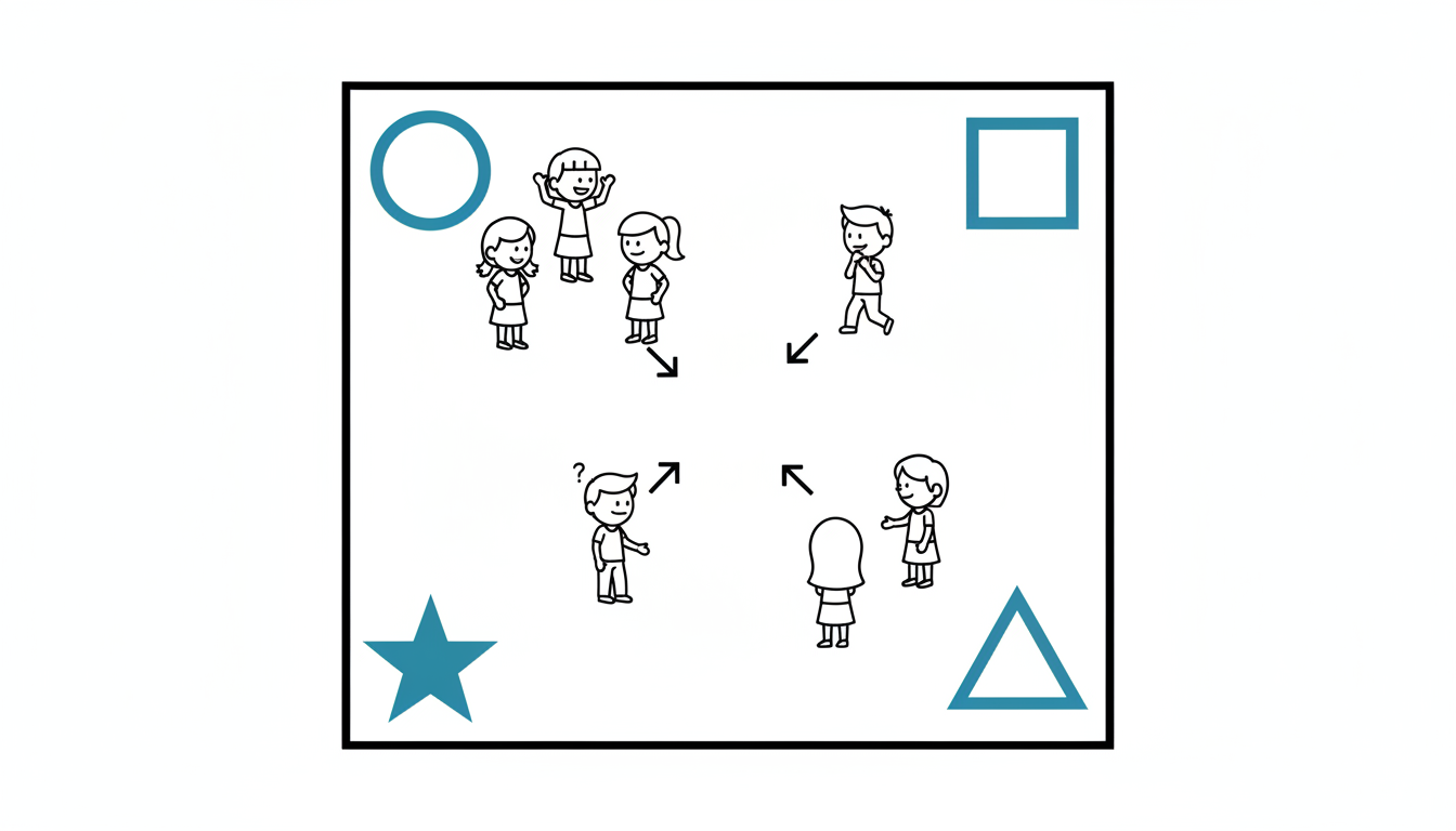 Labels: Confidence levels, skill mastery stages, readiness for test, interest levels • Follow-up: Differentiated tasks by corner, peer tutoring pairs, targeted mini-lessons • Ages: K-5: simple 3-corner system; 6-12: 4 corners; College: nuanced competency levels