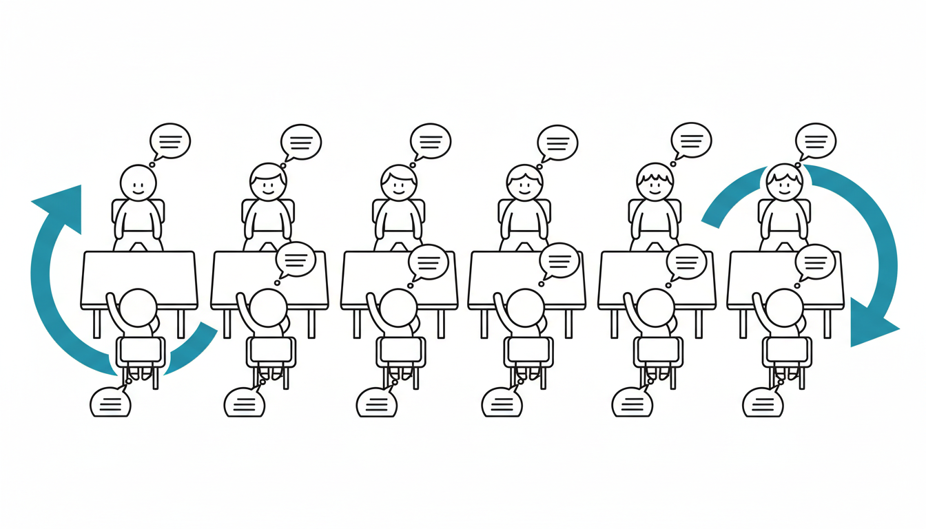 The "protégé effect" demonstrates that teaching material to others significantly strengthens the teacher's own understanding and retention (Chase et al., 2009). Multiple iterations with different partners provides distributed practice, immediate feedback through partners' comprehension (or confusion), and motivation to refine explanations. The physical rotation maintains alertness and prevents the conversation fatigue that sets in during extended single-partner discussions. Each new partner brings fresh questions or perspectives that deepen understanding.