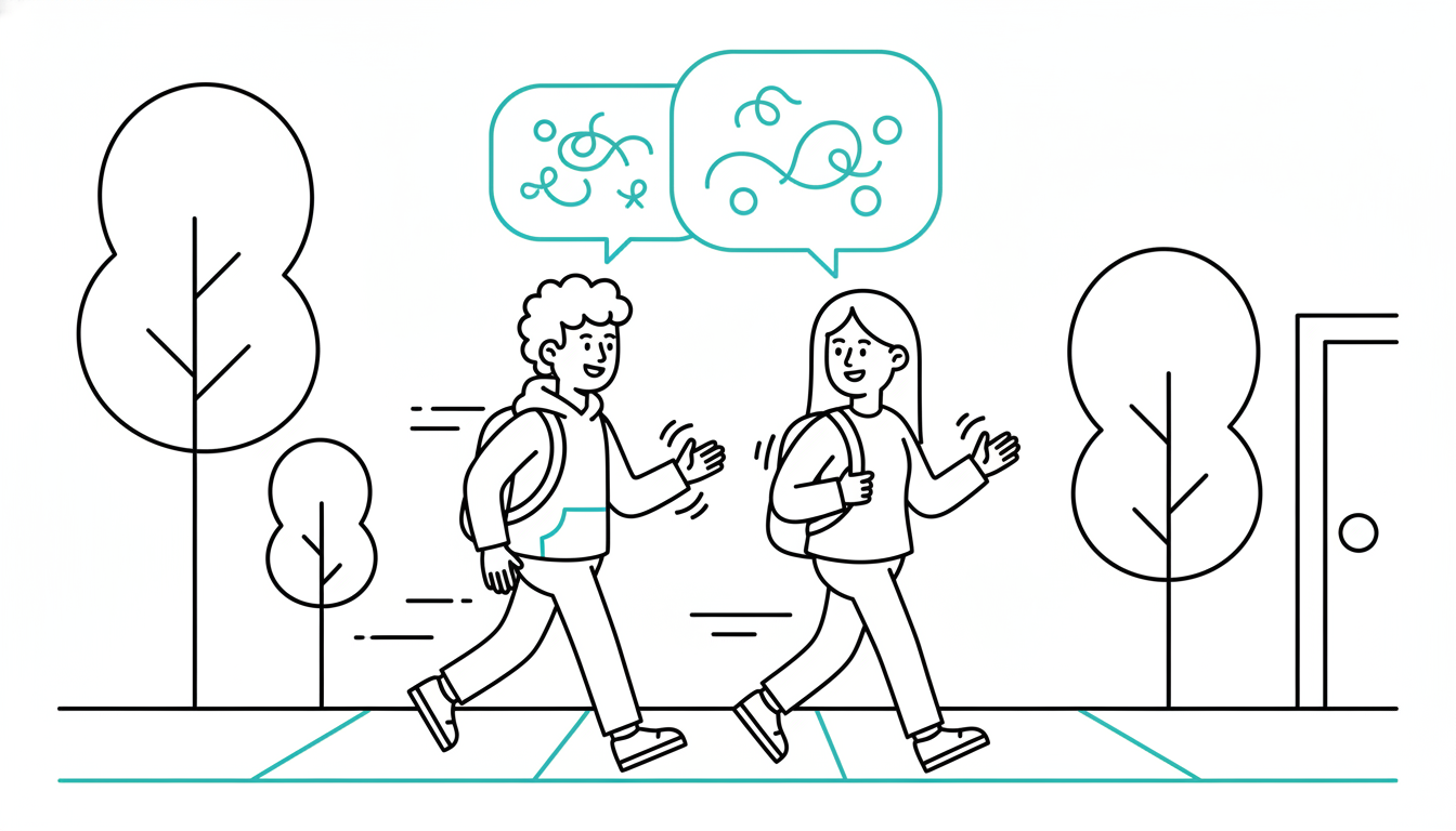 Bilateral movement (walking while both legs alternate) activates both hemispheres of the brain and has been shown to enhance creative problem-solving and associative thinking (Oppezzo & Schwartz, 2014). Walking side-by-side reduces the intensity of face-to-face eye contact, lowering social anxiety for students who find academic discussions intimidating. The environmental change (leaving the classroom) creates a context shift that refreshes attention, while the steady rhythm of walking creates a meditative state that can actually deepen focus on the conversation at hand.