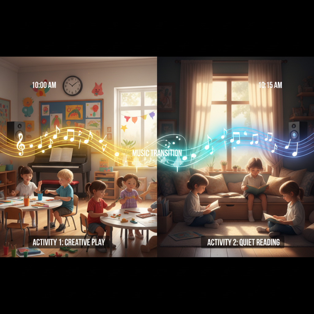 Create smooth, predictable transitions between activities using music as an auditory cue that signals time limits and activity changes, reducing transition chaos while using music's emotional and cognitive effects to set the tone for the next activity, whether calming students down or energizing them up, making transitions feel structured rather than arbitrary.