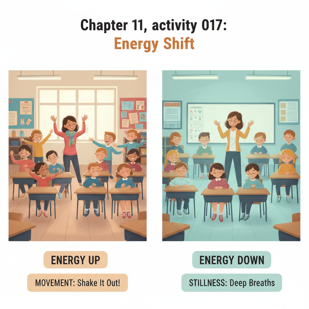 Before high-energy activity (group work, discussion): Shift UP Before focused work (test, reading, writing): Shift DOWN Before presentation or performance: Shift UP (alertness) then DOWN (calm nerves)