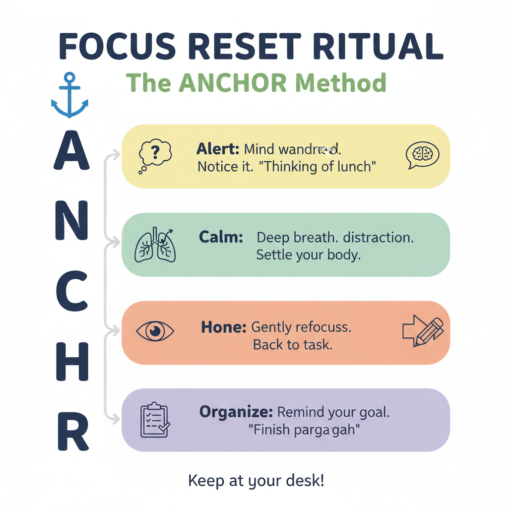 Teaching the ritual (first time): "Your attention will wander—that's normal. What matters is bringing it BACK. We're going to learn a focus reset ritual you can use anytime you catch your mind drifting. Here's how it works..."