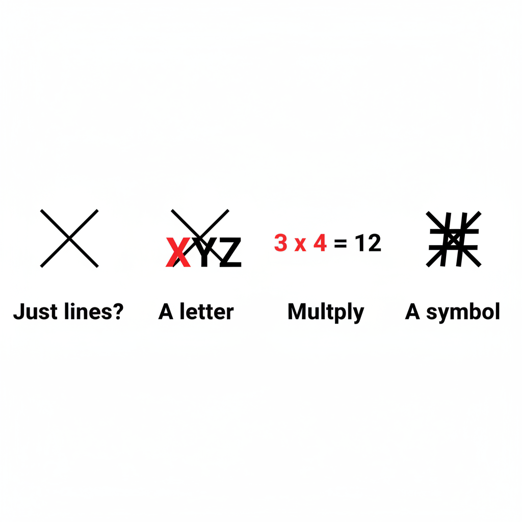 - ADD CONTEXT — Round 2 (30 seconds) — Erase the Y and Z. Before one of the crossing lines, write 1. After it, write 2. Below, write = 2. So it reads: 1 × 2 = 2. Ask: "What does this mean now?" Everyone says "multiplication." The same crossing lines — completely different meaning.