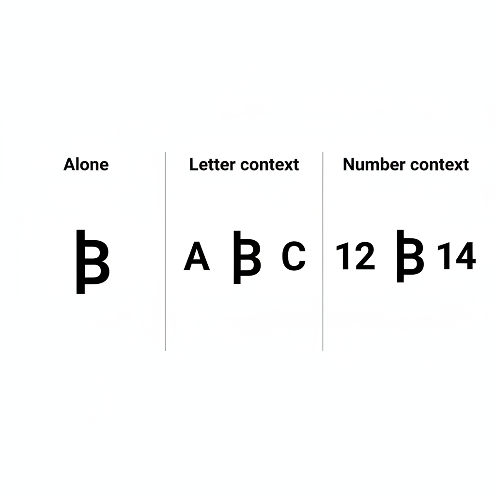 - THE LESSON (30 seconds) — "The character didn't change. Not a single pixel. But when I put it between letters, you saw a letter. When I put it between numbers, you saw a number. Your brain didn't analyze the character — it analyzed the CONTEXT and assigned a category before you even started thinking."