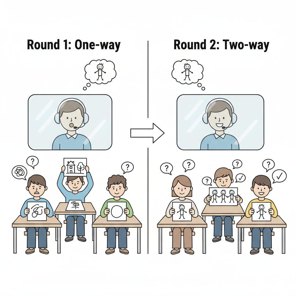 Use genuinely simple images — a stick figure, a house with a chimney, a smiley face. If the image is too complex, Round 1 becomes frustrating rather than instructive. The point isn't to draw something hard; it's to see how even SIMPLE communication fails without feedback.