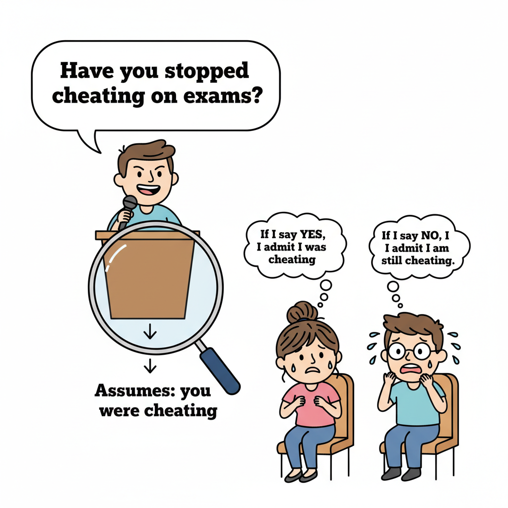 - THE LOADED QUESTION (15 seconds) — Ask the audience, seriously: "Have you stopped cheating on your exams?" Wait. Watch the discomfort. Both "yes" and "no" are problematic. "Yes" implies you used to cheat. "No" implies you still are.