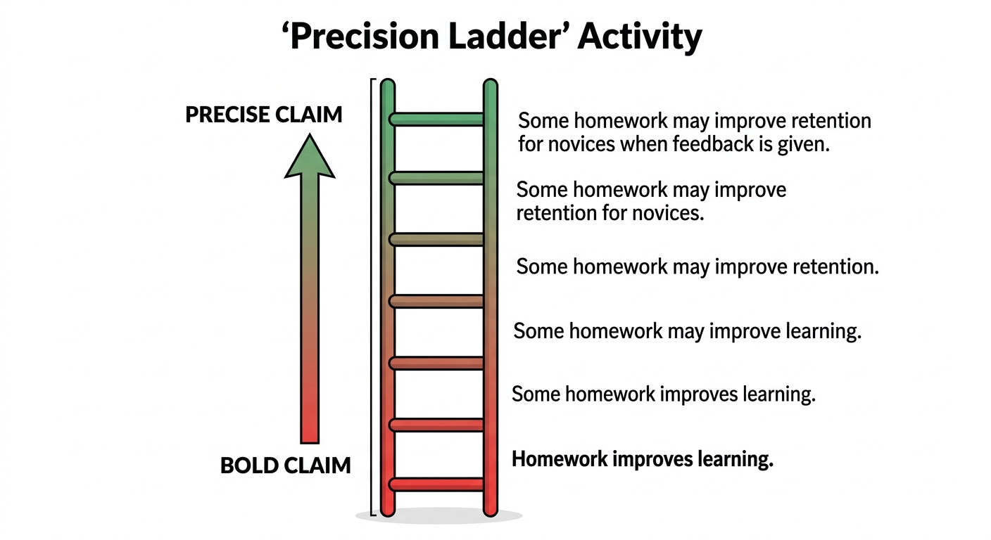 - Deepen: Give students an AI-generated claim and ask them to "climb the precision ladder" — adding qualifiers until the claim is defensible. Track how many qualifiers are needed. "If the claim needed 5 qualifiers to become true, how much was the original claim worth?"