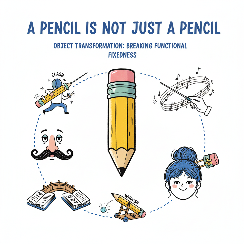 - THE LESSON (30 seconds) — "A pencil is only a pencil when it interacts with paper. In a conductor's hands, it's a baton. In a spy movie, it's a weapon. The object didn't change — your CONTEXT for it did. This is functional fixedness: the brain locks an object to its manufactured purpose. Breaking that lock is the first step in innovation."