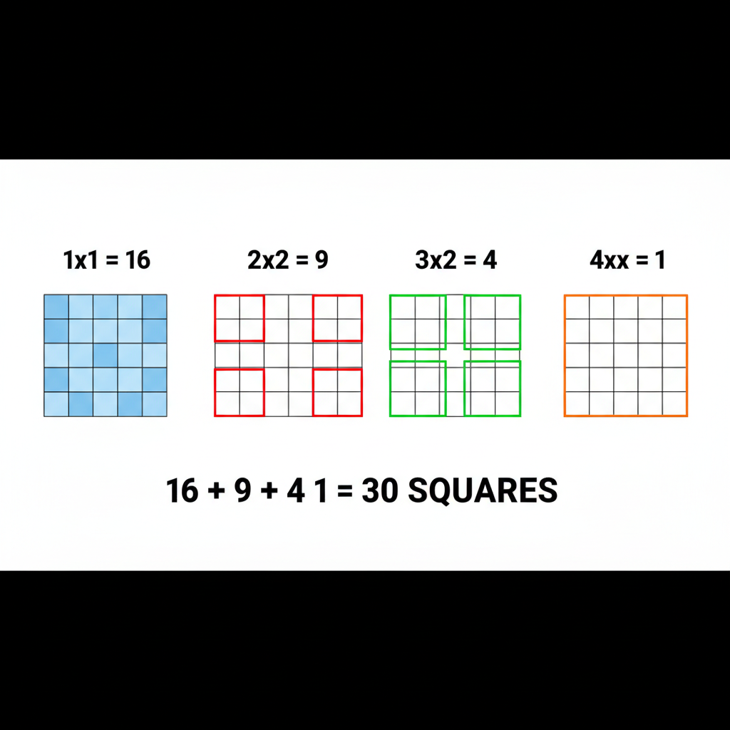 The math itself is satisfying: 1² + 2² + 3² + 4² = 1 + 4 + 9 + 16 = 30. For a general n×n grid, the total number of squares is n(n+1)(2n+1)/6. This formula-reveal can add an extra "aha" for math-oriented audiences.